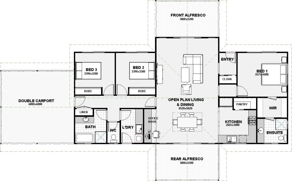 This simple and cost effective design is all about outdoor living with two three metre deep alfresco’s under the main roof on opposite sides of the home. Windy on one side, you get to entertain on the other.