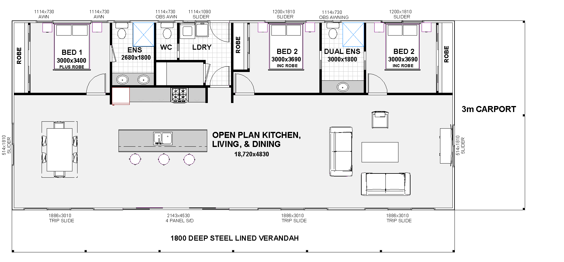 We now offer a three bedroom, two bathroom version with the same design flexibility Straight Edge Steel Frame Homes is known for.